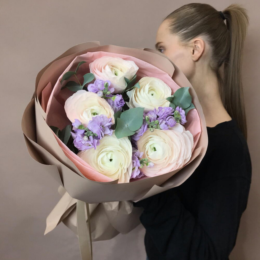 Букет из розовых ранункулюсов и сиреневой матиолы в Выксе